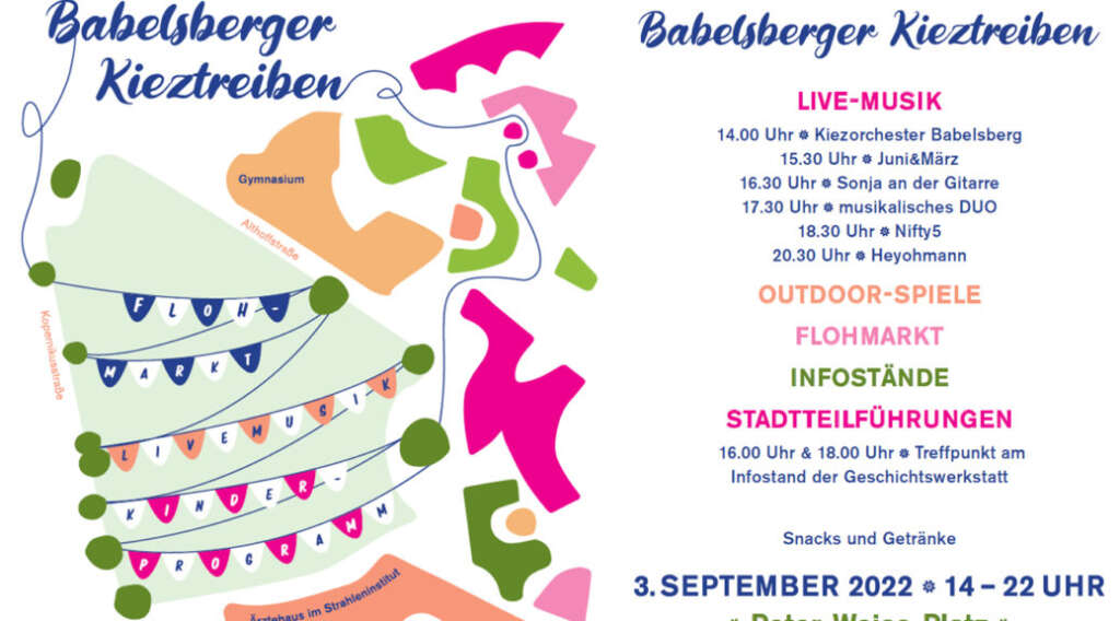 Als Stadtteilkneipe haben wir am 3. September das erste Mal die Möglichkeit, in unserem Babelsberger Kiez bei einem Stadtteilfest die Getränkeversorgung zu übernehmen. Somit können wir als Genossenschaftskneipe in den Kiez hineinwirken, was uns sehr freut. Das „Babelsberger Kieztreiben“, so der Name des Stadtteilfestes, findet am Samstag, den 3. September, zwischen 14 und 22 Uhr auf dem Peter-Weiss-Platz vor dem Strahleninstitut statt. Es gibt Konzerte, Outdoor-Spiele, Flohmarkt, Infostände und Stadtteilführungen. Organisiert wird es von Potsdamer Akteuren und Nachbarschaftshäusern. Kommt gerne rum, trinkt mit uns und genießt den Babelsberger Flair.